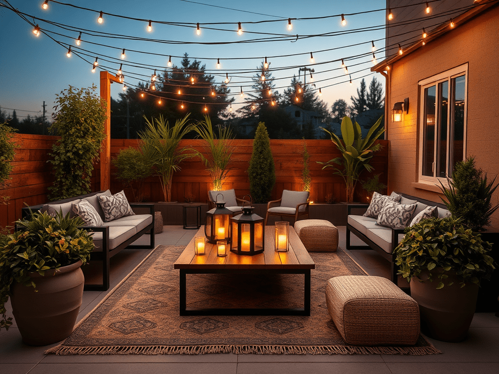 There’s something magical about warm outdoor string lights. Drape them along a fence, over your balcony railing, or zig-zag them above your patio for a cozy, café-like glow.